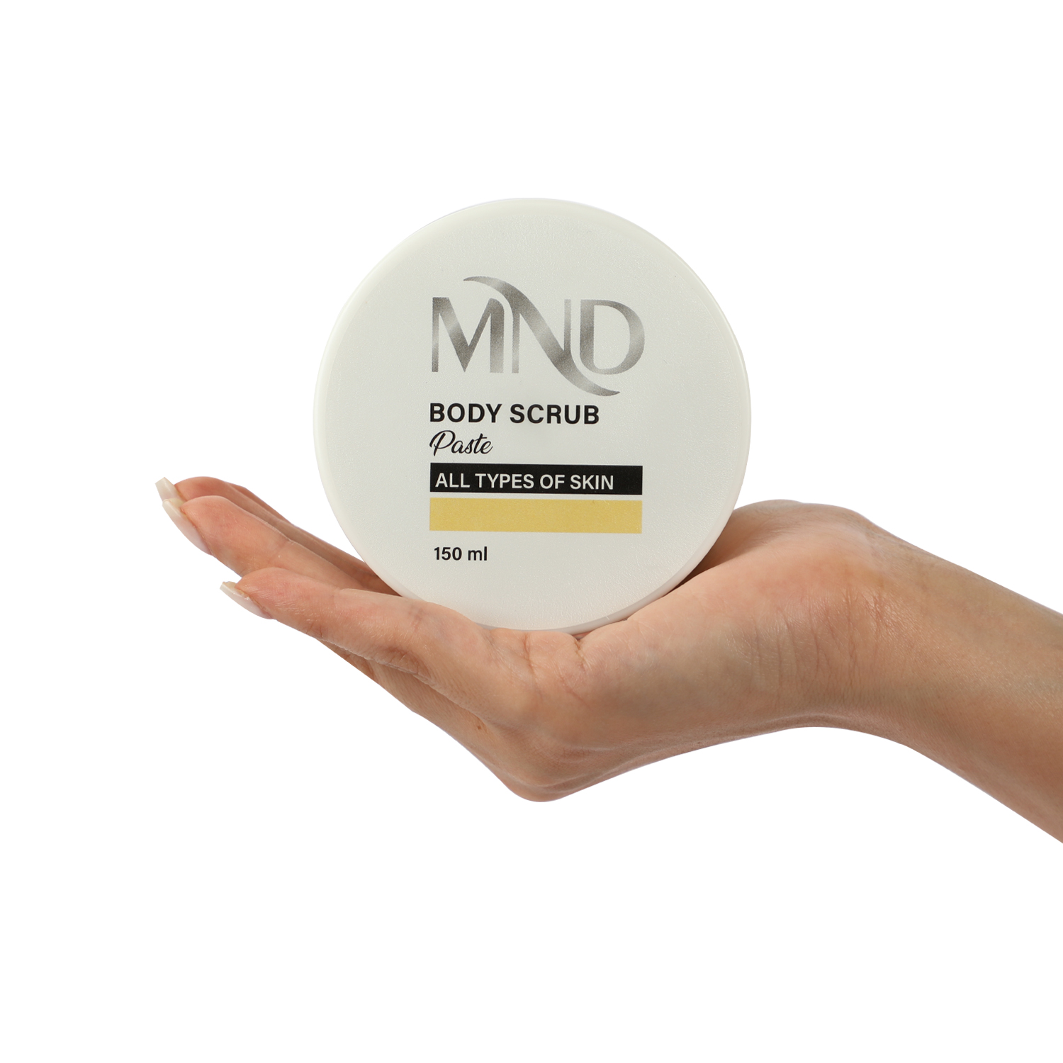 خمیر اسکراب بدن ام ان دی، محصول حاضر به صورت ویژه برای پوست بدن و براساس ذرات اسکراب غیرپلاستیکی یعنی سدیم کلراید و ساکارز تولید شده است.