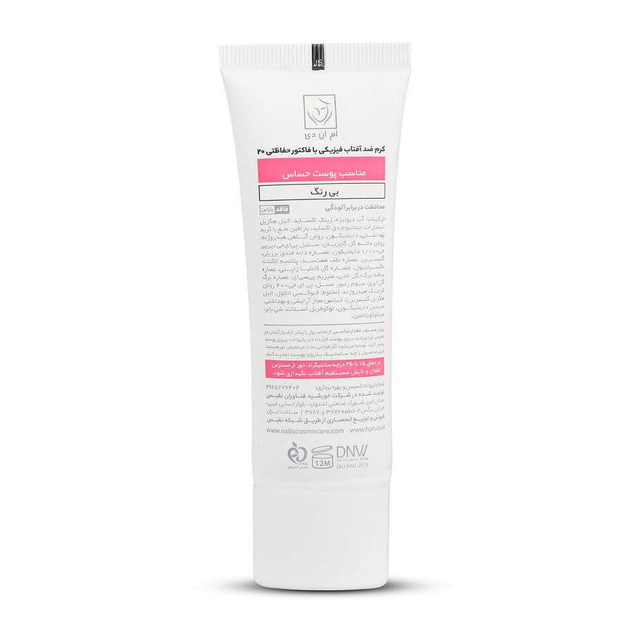 کرم ضدآفتاب ام ان دی SPF20 پوست حساس، این محصول به صورت فاقد پارابن و مناسب برای پوست حساس تولید شده و با بهرهگیری از ترکیبات و فیلترهای مناسب قادر است مانع صدمه دیدن پوست توسط اشعه های فوق الذکر شود.